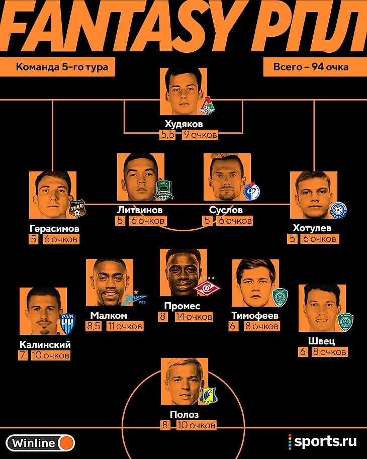 ⭐ Сборная 5-го тура в Fantasy РПЛ: Промес опять разрывает, вратарь «Локо» тащит, а двое – только из «Ахмата»