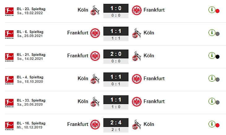 Исторически оба клуба часто делили очки друг с другом - «Кельн» не играл вничью с какой-либо другой командой так часто, как с «Айнтрахтом» (28 раз), и, наоборот, Франкфурт не делил очки с какой-либо другой командой чаще, чем с «Кельном» (это было также 28 раза). Единственный такой соперник – Гладбах, так же 28 раз.
