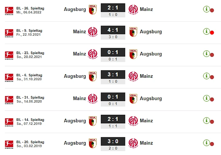 «Аугсбург» праздновал уже 11 побед в Бундеслиге над «Майнцом», более ни с одним клубом такой серии побед не сложилось. При этом «Аугсбург» последние шесть домашних игр против «карнавальщиков» выиграл: пять в Бундеслиге и одну в Кубке Германии ( в октябре 2018).