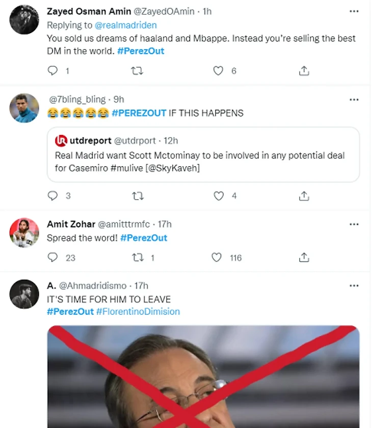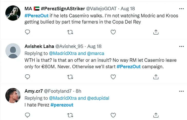 «Что происходит? Это предложение или издевательство? Не стоит отдавать Каземиро за 60 млн евро. Никогда. Иначе мы запустим кампанию #PerezOut»