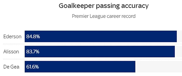 Точность передач Давида Де Хеа в АПЛ составляет немногим более 61%, что в сравнении с показателями Алиссона и Эдерсона очень мало.