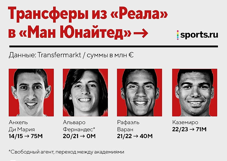 Каземиро – игрок «Манчестер Юнайтед»: бразилец едет в Англию за новым вызовом, за него заплатят 60 млн фунтов сразу (71 млн евро) и еще 10 в качестве бонусов. Если вы до сих пор в шоке от этого факта, вот еще один: это только третий трансфер (или четвертый с оговоркой – о ней в тексте) «Юнайтед» из «Реала».
