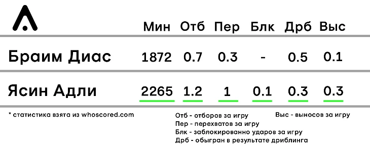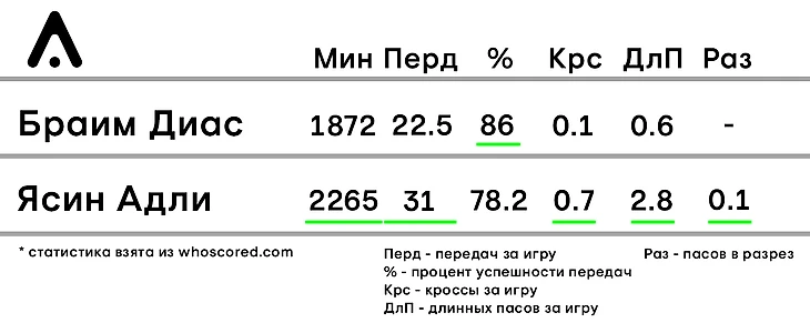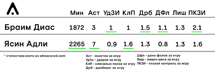 Из плюсов - это то, как Адли работает с мячом, он очень хорошо видит игру, а также является хорошим распасовщиком. Углубляться в его статистику не будем, а просто сравним француза с Браимом Диасом, который отыгрывал ту же роль в «Милане»: