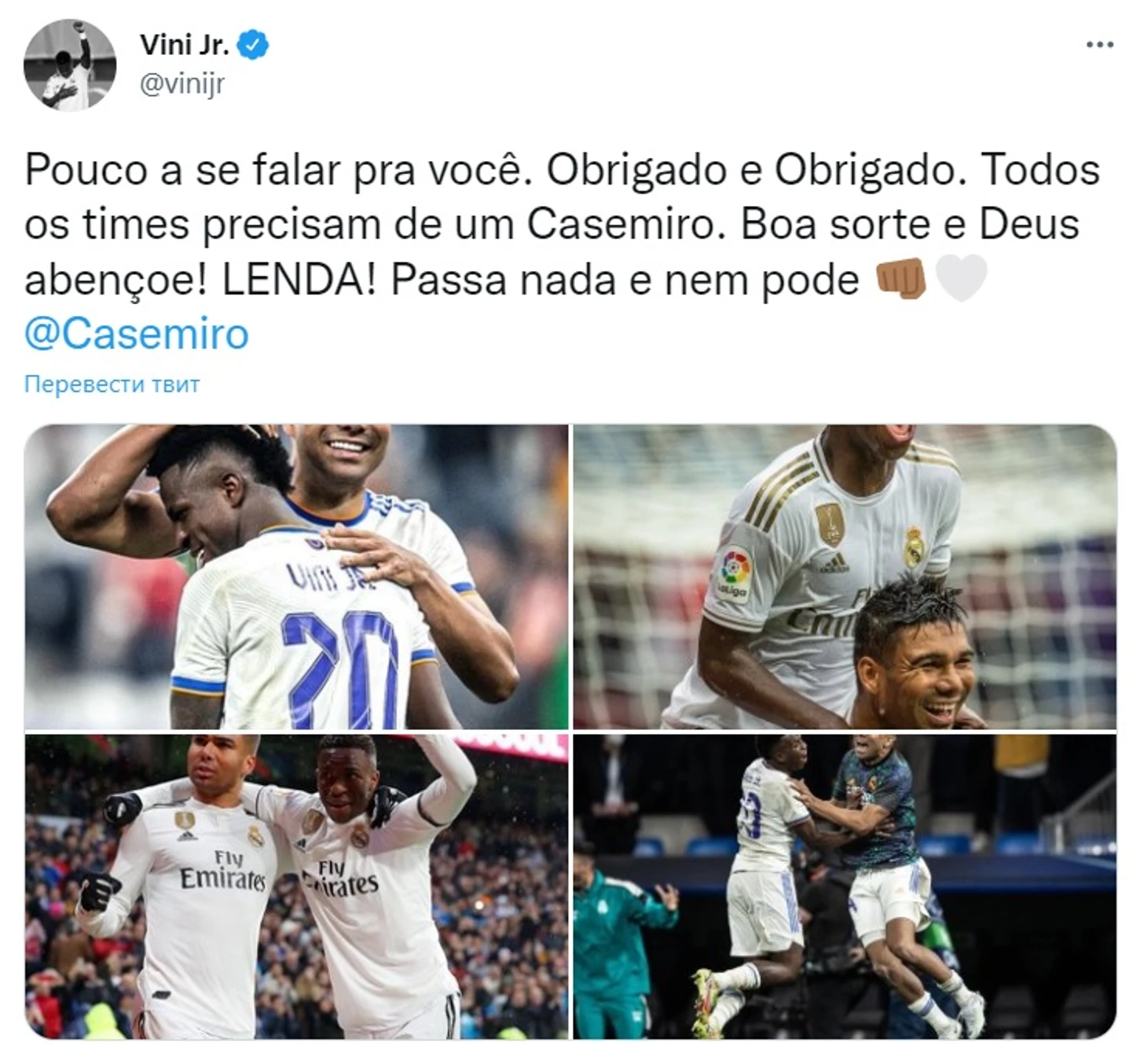 Винисиус Жуниор выложил совместные фото: «Слов недостаточно. Большое спасибо. Всем командам нужен Каземиро. Удачи и дай Бог здоровья! ЛЕГЕНДА!»