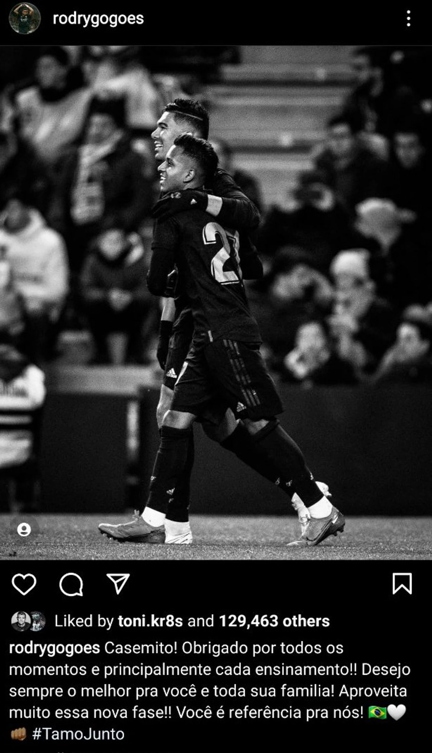 Другой бразилец, Родриго Гоэс, написал в инстаграме: «Каземиро! Спасибо за каждое мгновение и особенно за каждый совет!! Я всегда желаю добра тебе и твоей семье! Наслаждайся новым этапом!! Ты для нас ориентир!»