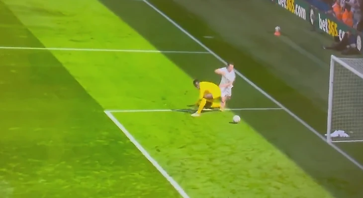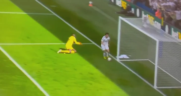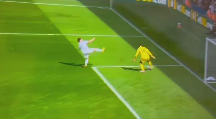 Ааронсон решил включить прессинг и поддавил вратаря «Челси» в штрафной. Менди попытался ложным движением обмануть соперника и красиво сохранить мяч, но что-то пошло не так.