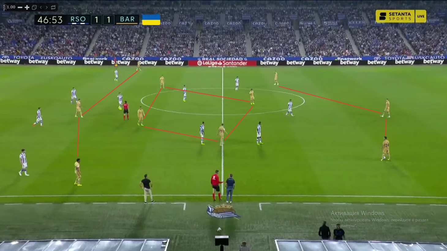 «Реал Сосьедад» действует по схеме 4-4-2 с ромбом в центре поля, то есть насыщает середину четвёркой футболистов. Стартовый план Хави учитывал данную особенность. Формацию «Барселоны» можно было записать как 3-4-3, отправляя Бальде и Дембеле в атакующую тройку или как 3-4-2-1, ставя их на позицию латералей.