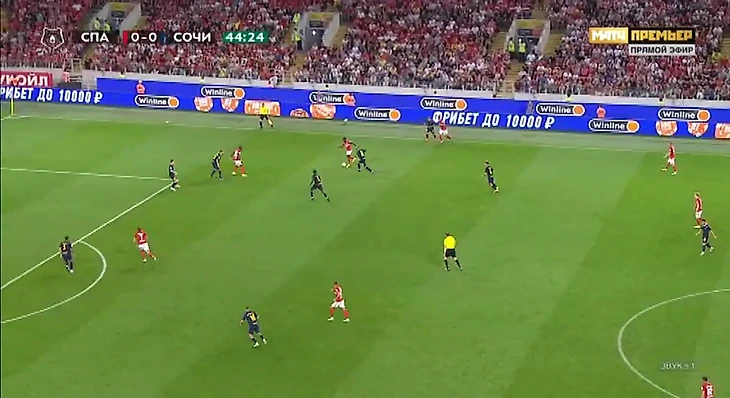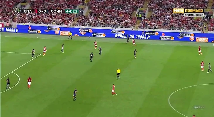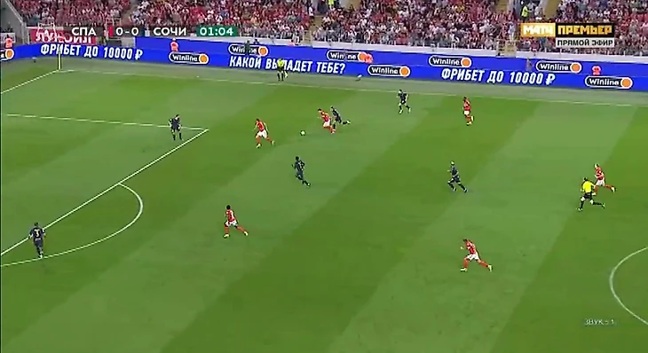 А вот Игнатова держит Дркушич. Макарчук опускается, и игроки «Сочи» сохраняют «цельную» четвёрку в линии обороны. Снова последовал длинный пас на Соболева.