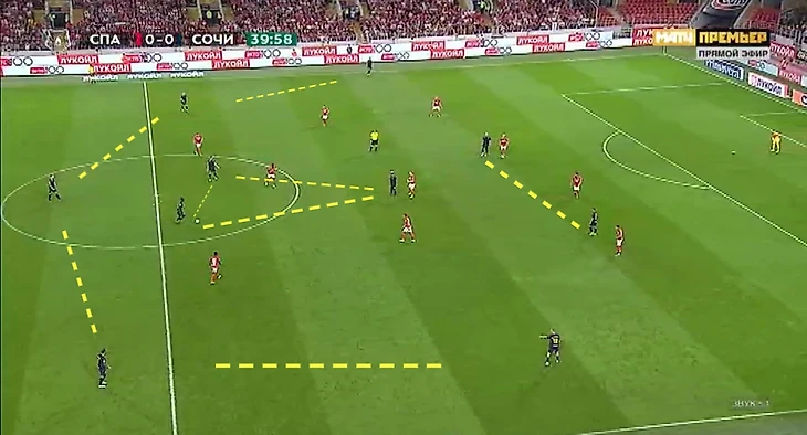 В других ситуациях, когда крайние защитники действовали уже, игроки «Сочи» получали свободу на флангах. Благодаря хорошим взаимодействиям игроков центра и качествам Нобоа в продвижении мяча, удавалось проводить вертикальные атаки.