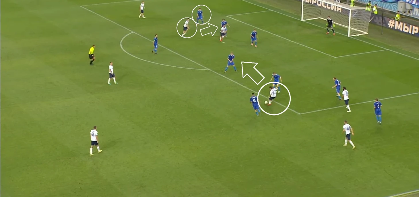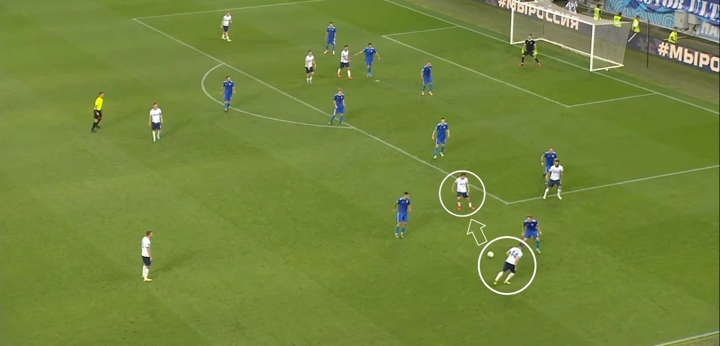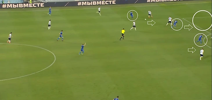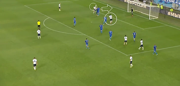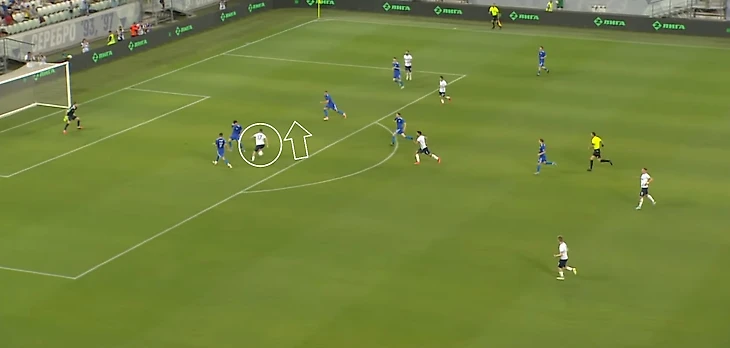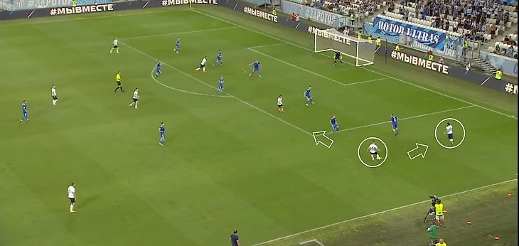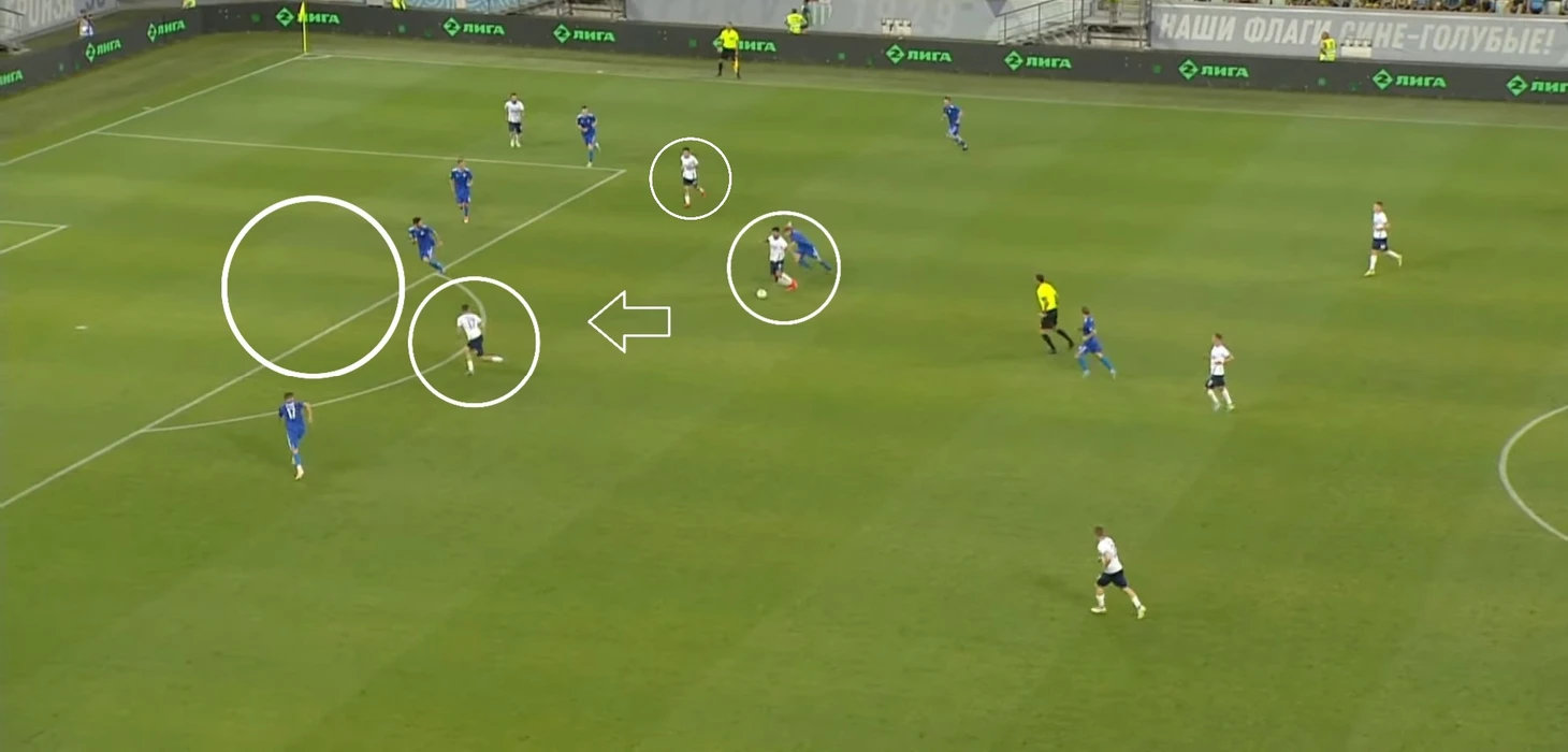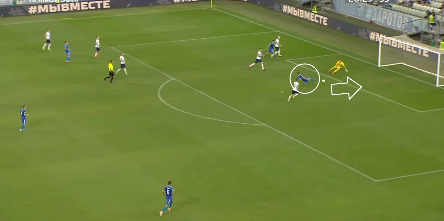 Один из двух игроков обороны опекавших #22, опустился глубже в штрафную площадь, тем самым предоставив пространство, чем Родионов и воспользовался, быстро развернувшись лицом к воротам