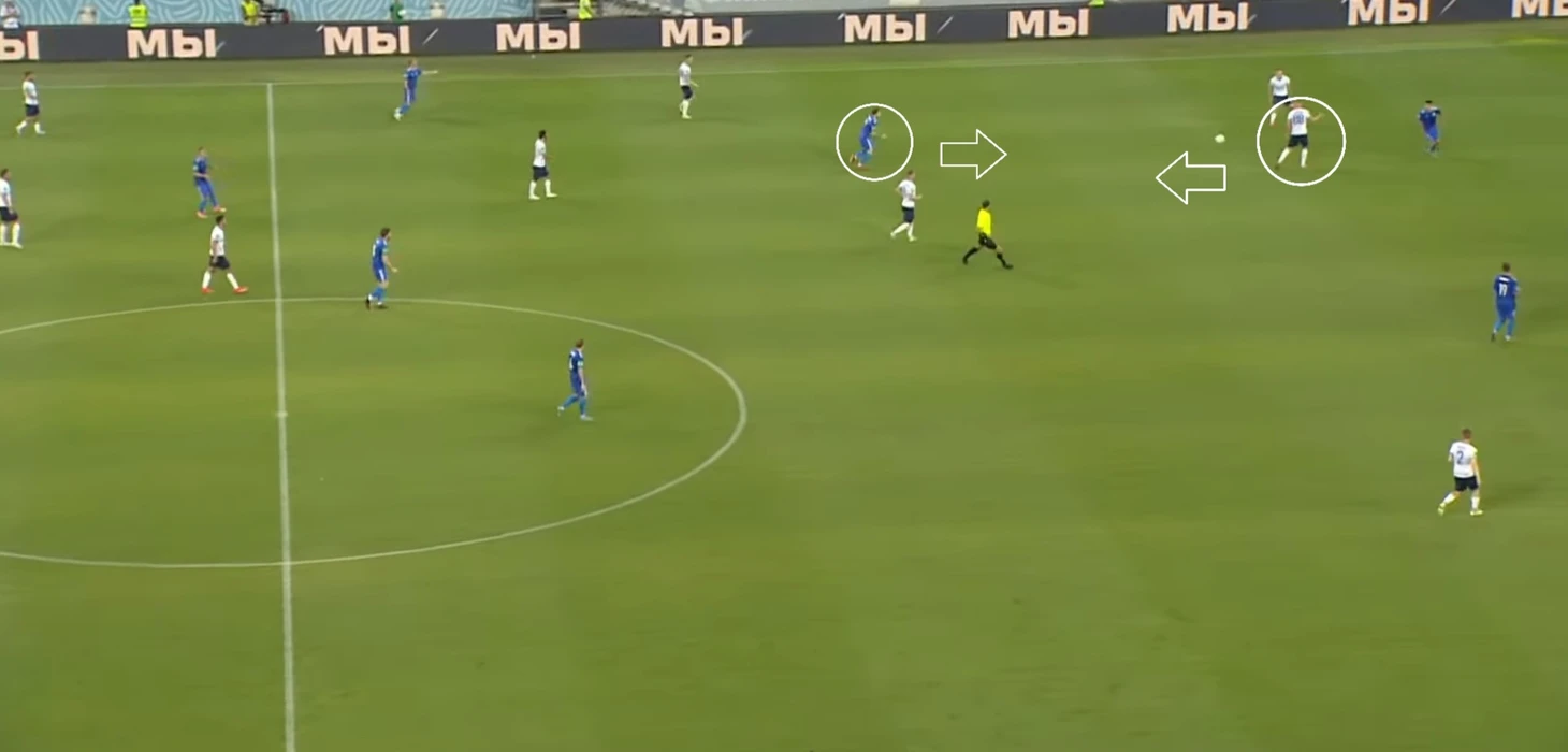 1️⃣.1️⃣Начальная фаза. Выиграв немного пространства в центре поля, #8 Мартусевич, выполняет длинную передачу на правый фланг атаки. Вариантов развития было не так много. Если говорить об обострении, то возможна передача и на левый фланг, но именно на правом было два игрока в более выгодной позиции.