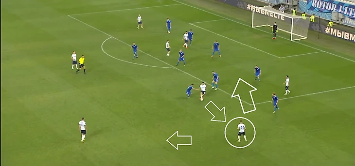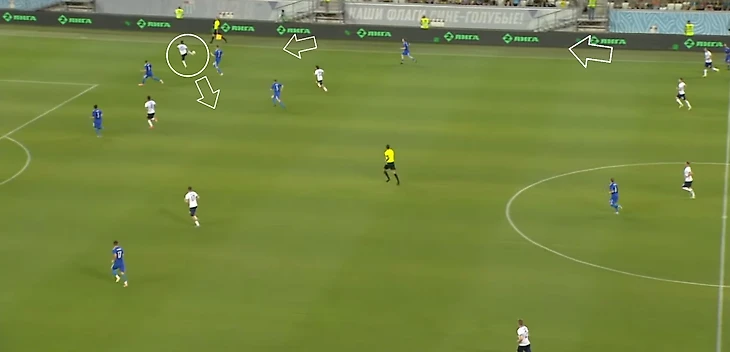 1️⃣.2️⃣ Здесь у #44 Бутаревича тоже немного вариантов развития атаки, именно на обострение: забегание #10 Ахмедханова по флангу и второй вариант создал #22 Родионов, благодаря своему грамотному занятию позиции. Считаю, что выбран наиболее правильный вариант, так как продвижение во фланг не несет в себе такой вариативности, как переход от фланга в центр. Поясню, на фланге возможностей у #10 не так много: либо пробовать проходить в штрафную самостоятельно с помощью дриблинга, что, скорее всего, приведет максимум к угловому. Либо подача в штрафную, которую тоже может прервать вратарь выходом навстречу мячу и началу контратаки.