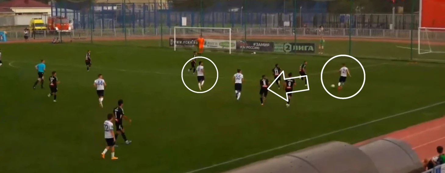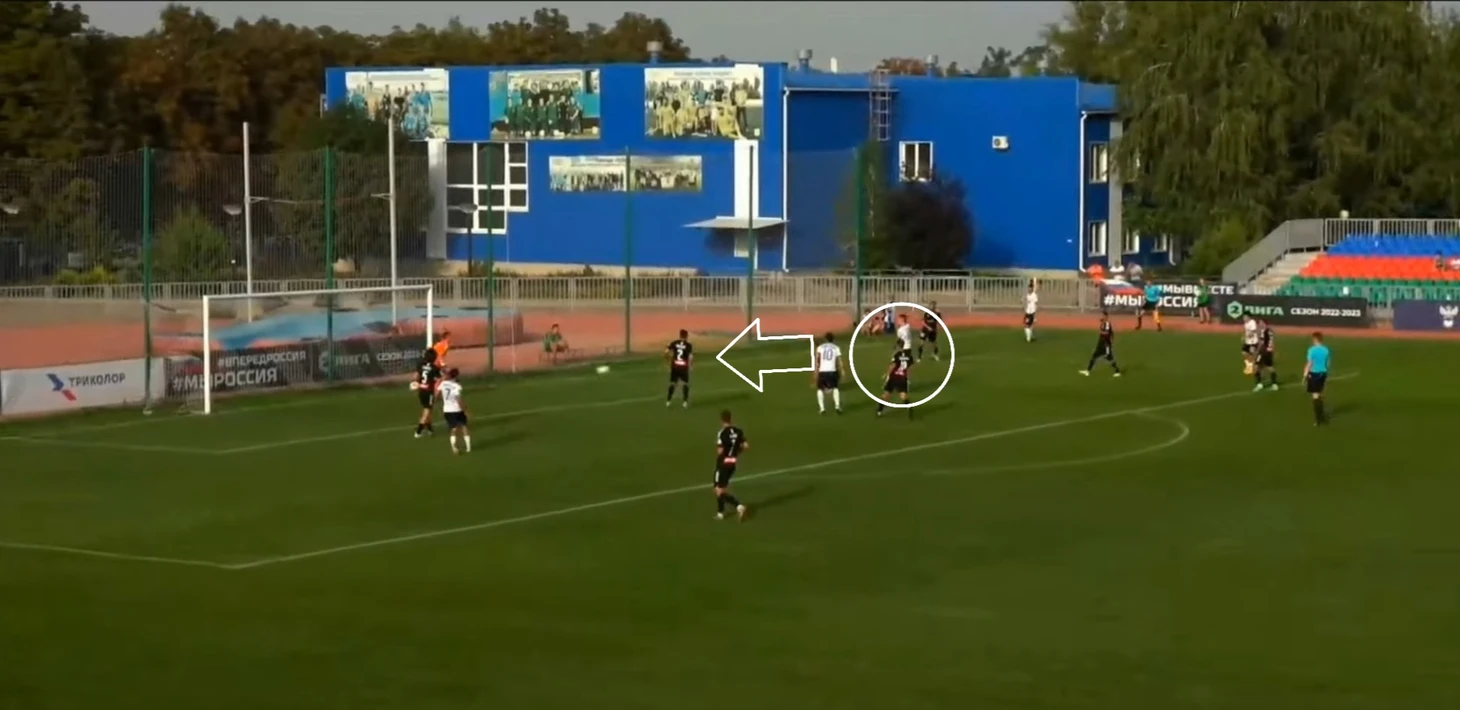 3️⃣.3️⃣#2 совершает прорыв глубже во фланг. Ускорение и движение к воротам от #11 Умарова. Следует передача на линию штрафной.