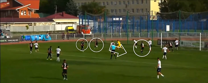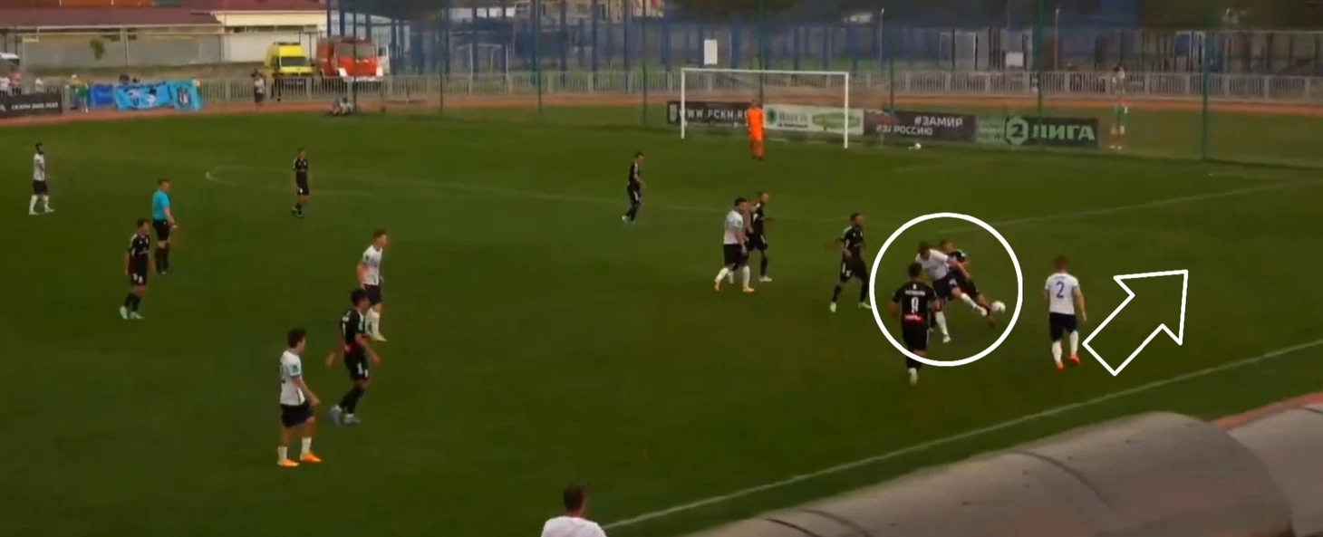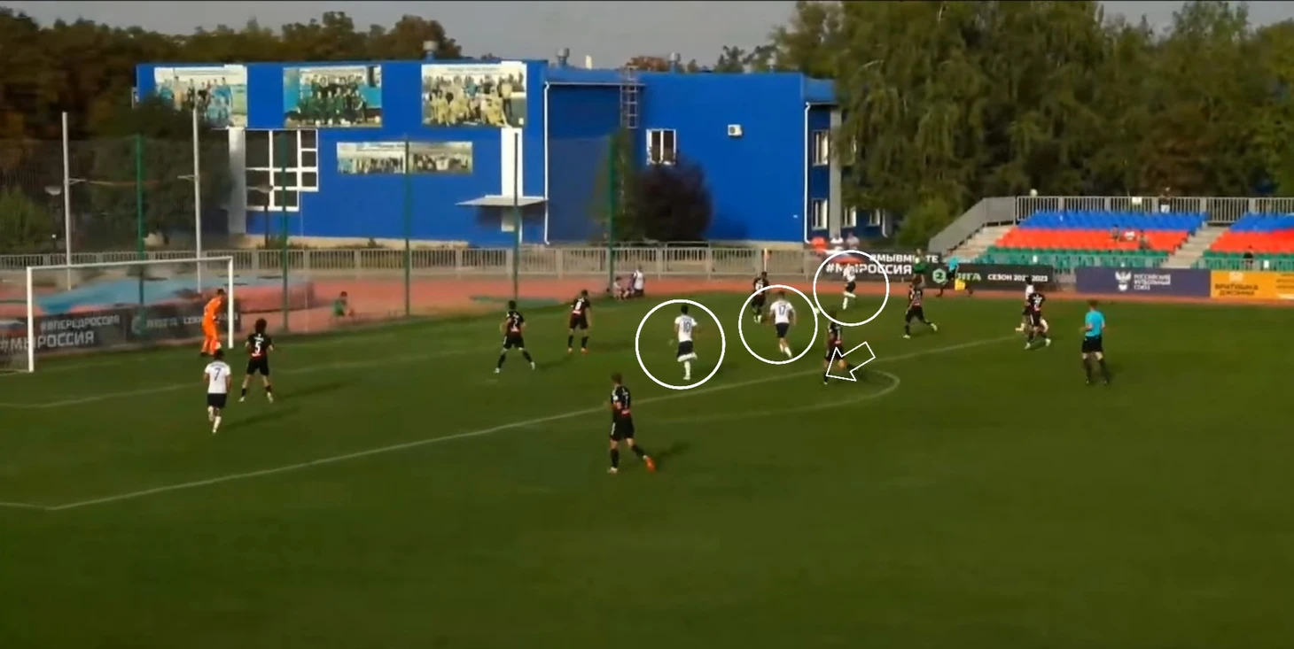 2️⃣.2️⃣ #63 находит идеальное решение ситуации - передача в одно касание на набегающего #17 Сафронова. Стоит заметить, что это было не единственное решение эпизода - чуть ближе к центру так же в прекрасной позиции находится #10 Ахмедханов.