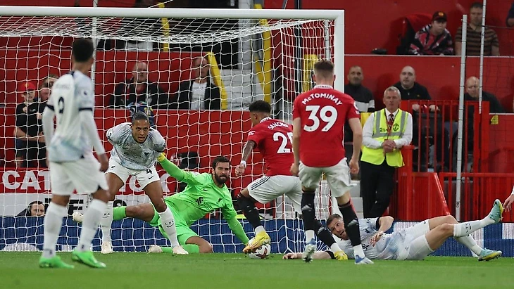 В таких принципиальных матчах нужно спасать свою репутацию. То ли приход Каземиро так вселил надежду, хотя бразилец наблюдал за матчем на трибуне, то ли пробег в 13,8 км после «Брентфорда» повлиял. Не захотев снова бегать изнурительный кросс, «красные дьяволы» настроились. С огнем в глазах или, как любил говорить Юрий Розанов, с глазами по восемь копеек, все бились за каждый, даже казалось безнадежно уходящий в аут мяч. С первых минут ребята Эрика Тен Хага просто набросились на «Ливерпуль», создав парочку классных моментов. Так что гол Джейдона Санчо, который изящно поиздевался над обороной и отправил в буфет вратаря Алиссона был логичен и выходил из логики начала матча.