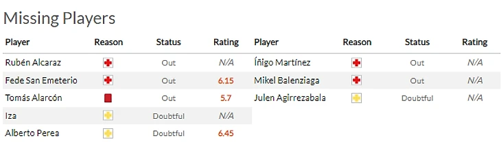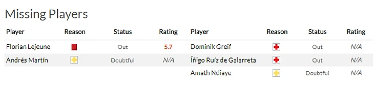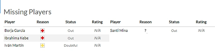 А вот коуч Хетафе был не очень осторожен и поэтому схлопотал аж двухматчевую дисквалификацию. так что в это воскресенье на скамейке хозяев вы не увидите ни Санчеса ни Флореса. Кроме тренера бан отхватил ещё а Левый латераль Анхилери(5,5), но его то можно заменить на какого-нибудь Дуарте(5,5) и особо никто не заметит подвоха.