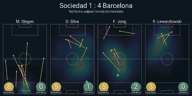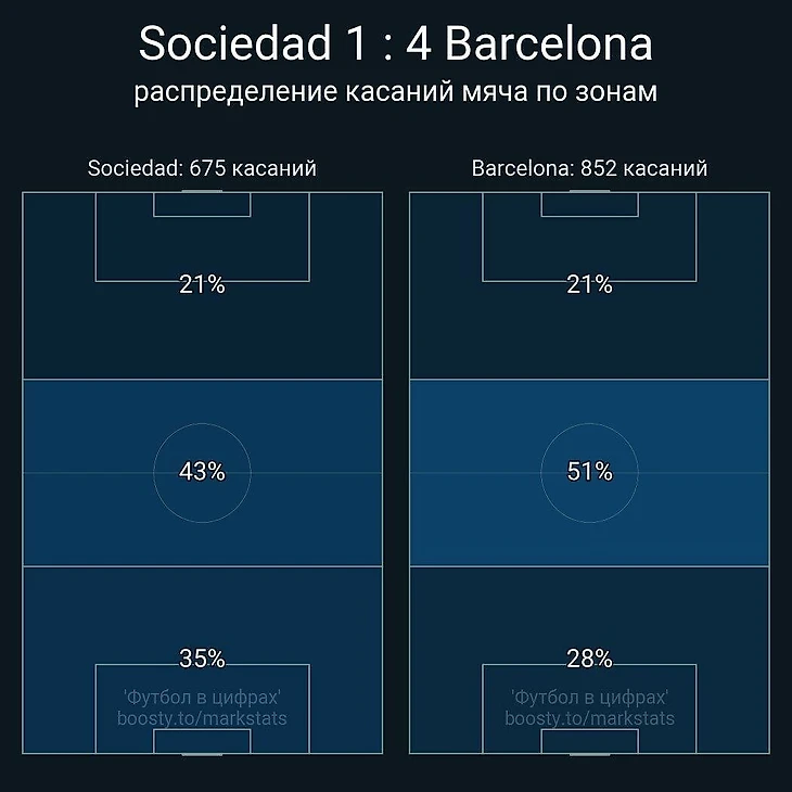 Если мячом в итоге овладевала «Барса», гости всем составом быстро смещались вглубь и садились компактным низким блоком со сверхнасыщенным центром поля, заставляя соперника откатываться назад и повторять все сначала. Если же борьбу выигрывали баски, они дальним пасом пытались отрезать всю высокую линию обороны сине-гранатовых, забрасывая мяч за спины защитникам на скоростных форвардов. Все это приводило к огромному объему борьбы в центре поля, большому числу передач с продвижением от тер Штегена (8, лучший в обеих командах) и офсайдов у «Реал Сосьедада» (4 против 0 у «Барсы»).
