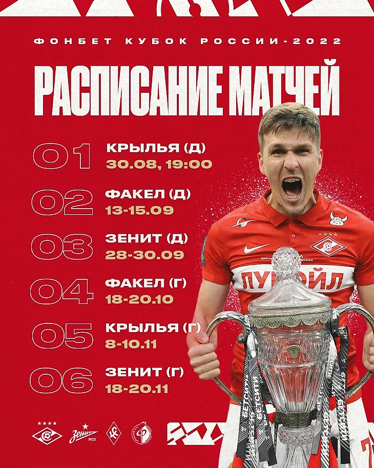 «Спартака», как нынешнего обладателя почетного приза, это касается в первую очередь. Ему даже выпала почетная, если так можно выразиться, миссия открытия группового турнира для команд, участвующих на этапе «Путь РПЛ». Сам «Спартак» сообщил, что уже «30 августа наша команда примет на «Открытие Банк Арене» самарские «Крылья Советов». Матч начнется в 19:00. О билетной программе мы сообщим дополнительно»…