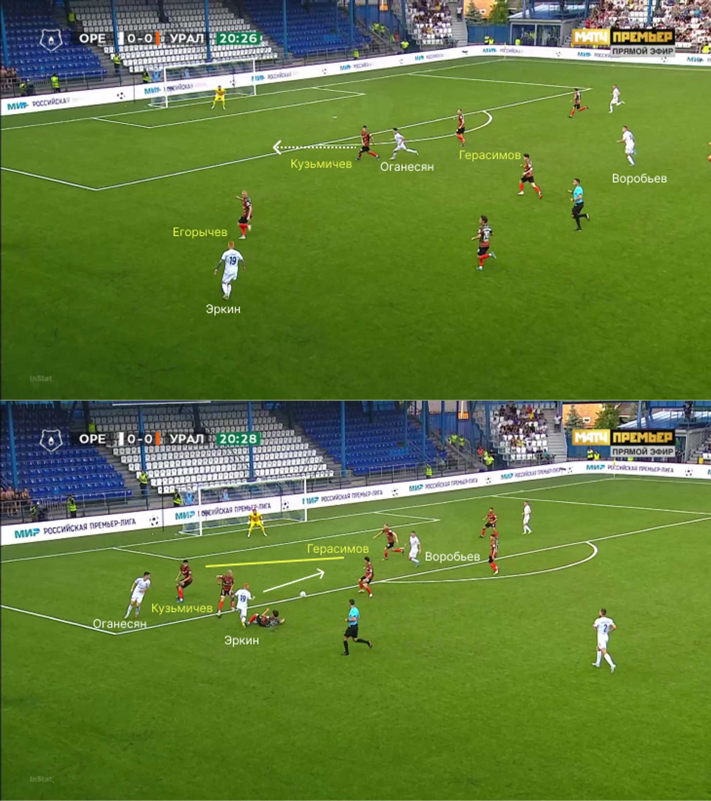 Дальше классно сработал Оганесян: увел центрального защитника (обеспечил разрыв между Герасимовым и Кузьмичевым, куда и покатил Эркин), тогда как Воробьев классно открылся в освобожденную зону.