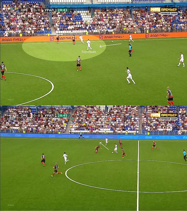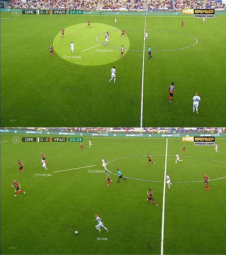В этом эпизоде так и случилось. Воробьев отскочил под борьбу, левый вингер Оганесян оказался под ним. После борьбы «Оренбург» перевел налево, где разгонялся Эктов, а нападающие остались в похожей структуре, в которой центрфорвард находился ниже.