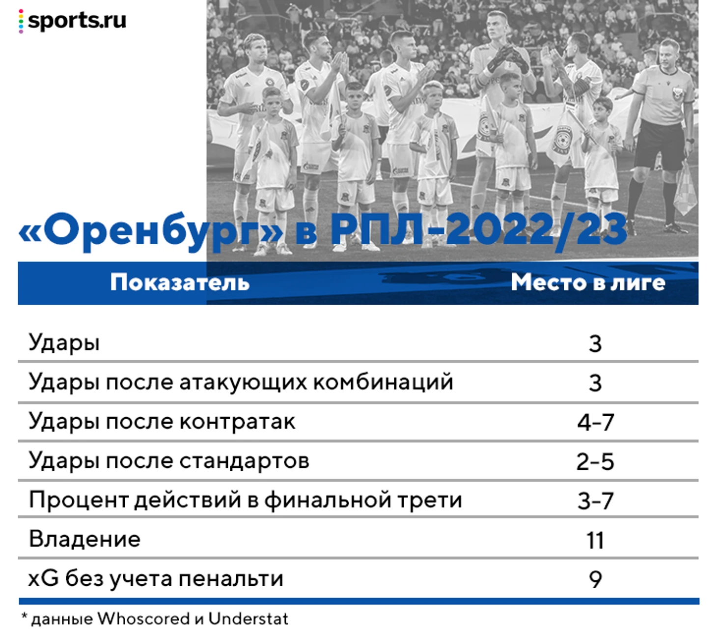 «Оренбург» занимает третье место РПЛ по количеству ударов (16,8), хотя идет на одиннадцатом по владению (45,3%). Агрессивную ментальность подчеркивают и другие факторы: если владение всех команд свести к 50%, оренбуржцы были бы самой бьющей, к тому же в топ-7 по ударам из штрафной и действиям в атакующей трети («Зенит» – 38%, «Спартак» – 31%, «Локомотив», «Сочи», «Ахмат», «Оренбург» – 30%) при условии, что только грозненцы меньше владели мячом.