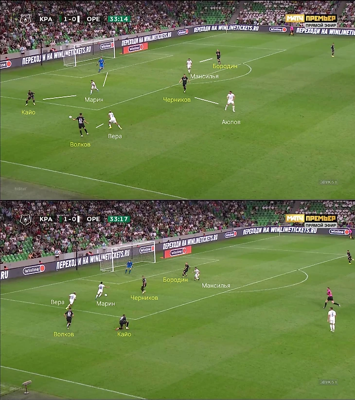 Смещение Мансильи при выносах Гошева влияло и на защиту «Краснодара». Два полумомента гостей – работа нападающего. В первом случае Кайо опередил Мансилью, но защитник ошибся с приемом, что помогло «Оренбургу» разогнать атаку с подключением нападающего под проникающую передачу (таймкод – 2:13). После пропущенного гола оренбургская девятка организовала еще один подход, когда Кайо неуклюже обработал мяч и оставил Бородина одного в центре защиты (таймкод – 3:23).