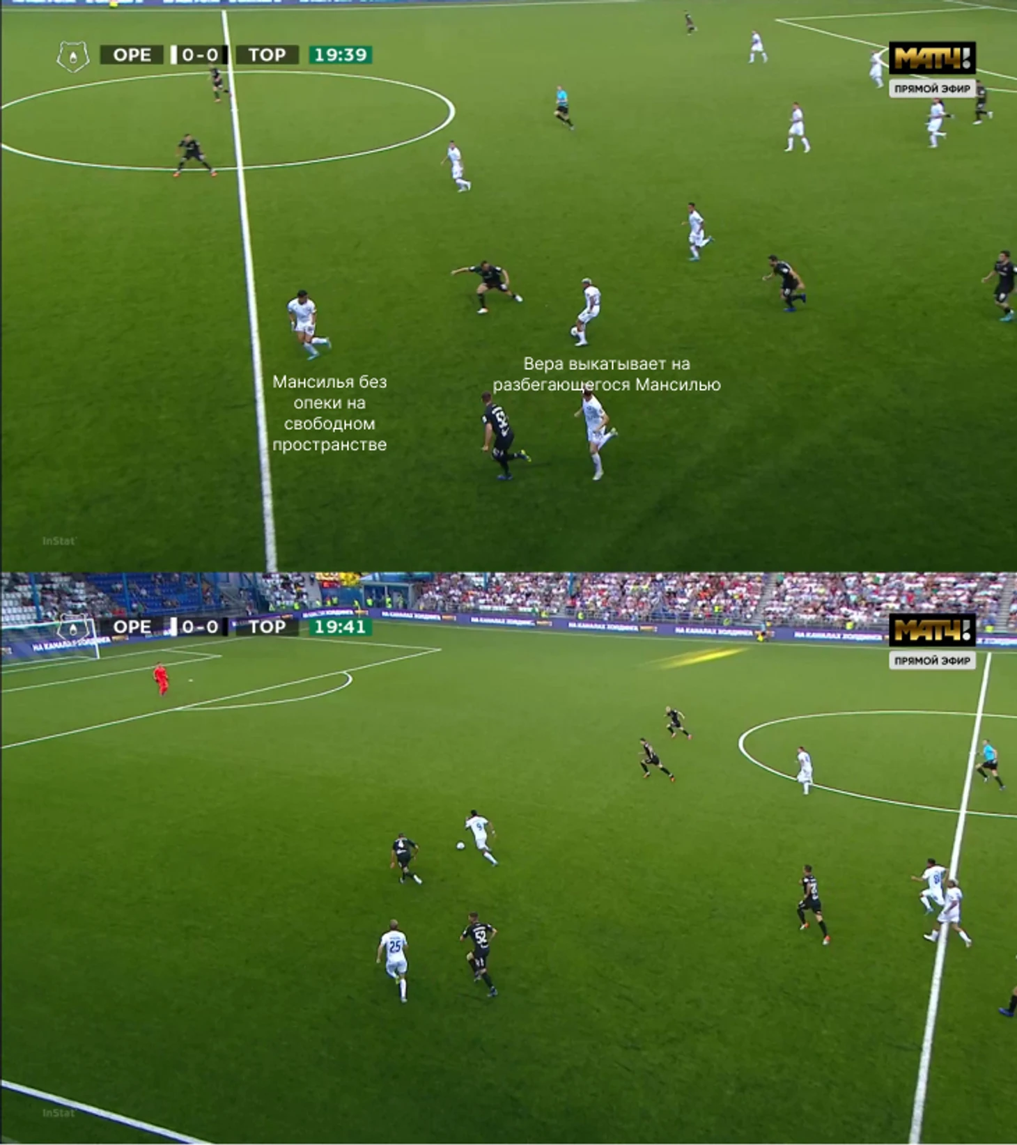 Удаление Кутепова тоже пришло после рывка Мансильи из глубины. У эпизода другие вводные: «Оренбург» глубоко оборонялся (нападающий опустился почти в защитную треть), затем отнял мяч и за несколько передач разогнал контратаку. В итоге Брайн получил мяч на скорости между Кожемякиным и Кутеповым.