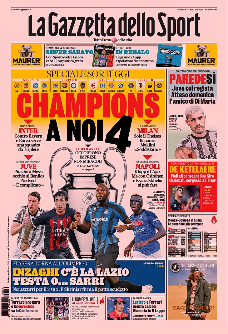 Итоги жеребьёвки Лиги Чемпионов, сегодняшний матч «Интера» с «Лацио», а также трансфер Паредеса в «Юве» – в обзоре заголовков итальянских спортивных изданий в блоге «В гостях у Кальчо».