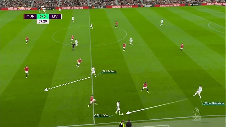 Когда Робертсон получил мяч от Диаса, которого прессинговал Диогу Далот, колумбиец мгновенно вернул его шотландцу, который под прессингом Джейдона Санчо отдал его дальше по флангу в сторону Милнера.