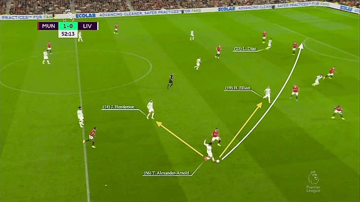 Но «Ливерпуль» испытывал проблемы в попытках найти выход из обороны против жесткой схемы и давления «Юнайтед». Поэтому Александер-Арнолд предпочел отдать мяч верхом на Диаса.