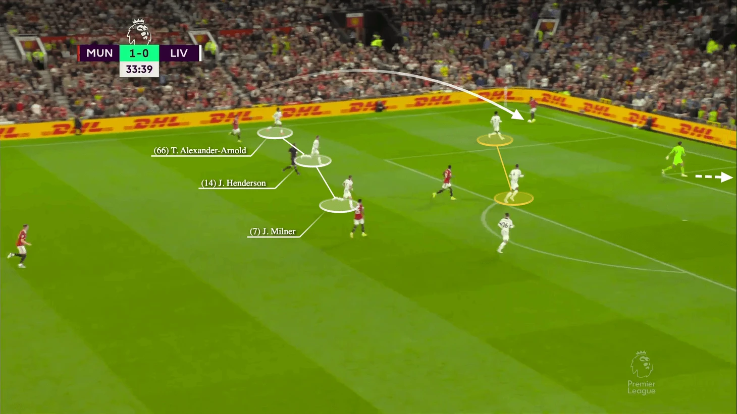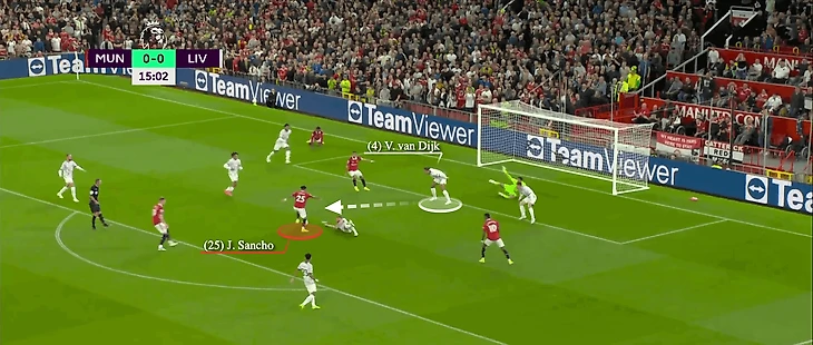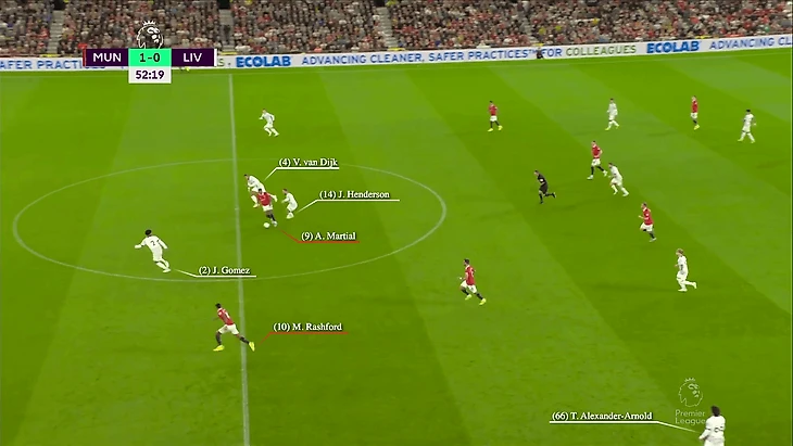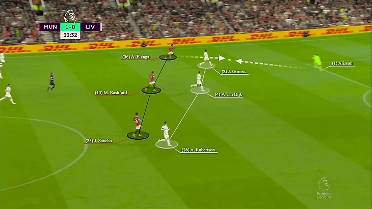 В этой атаке Александер-Арнолд располагался высоко на поле, что нормально, но это оставило «Ливерпуль» более уязвимым, когда «Юнайтед» атаковал. К счастью, Алиссон выбежал из ворот и устранил опасность.