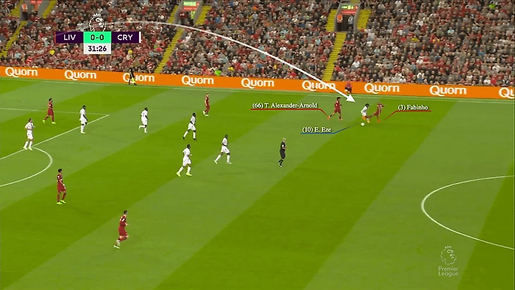 Если бы Фабиньо удалось сделать этот подкат, то возможности забить гол не было. Но его неспособность лишить Эзе владения оставила беззащитной высокую линию «Ливерпуля».