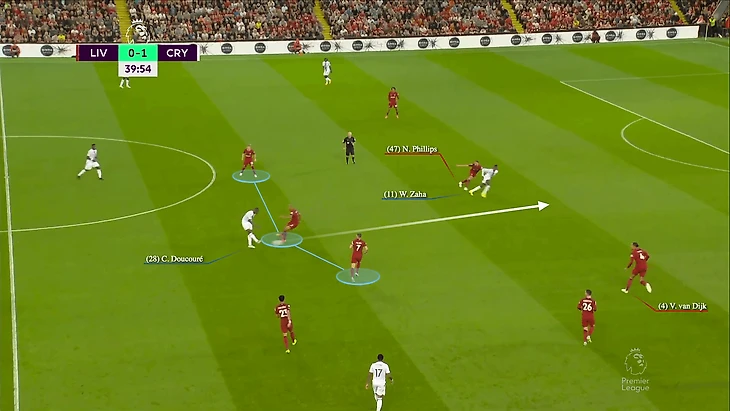 Фабиньо пошел в подкат на Дукуре, но полузащитник «Пэлас» все-таки сумел отдать пас. Это вывело полузащиту «Ливерпуля» из игры, что стало повторяющейся темой и на «Олд Траффорд» на следующей неделе.