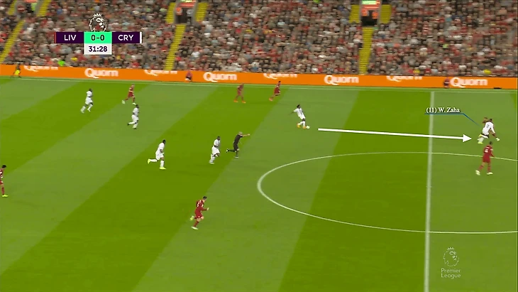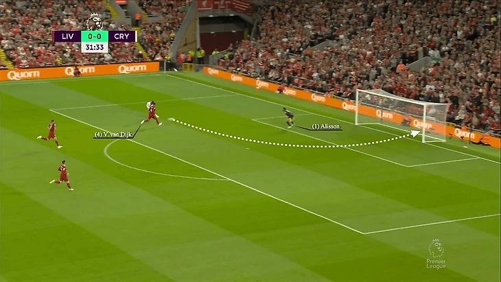 Ван Дейк отслеживал Заа, но затем сбавил скорость, вместо того чтобы выдавить игрока «Пэлас», позволил ему пробить (ниже). В первые недели сезона мы наблюдали, как Ван Дейк был менее эффективен, чем обычно, в моменты, когда он чаще всего доминировал.