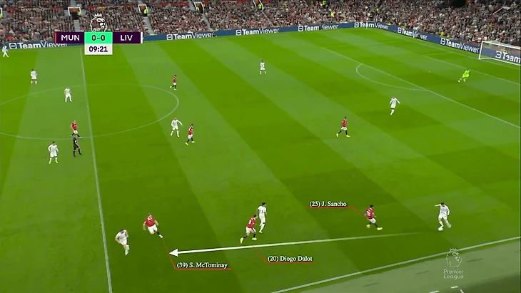 Этот пас был прерван Скоттом Мактомини, который затем отдал мяч на Бруну Фернандеша.