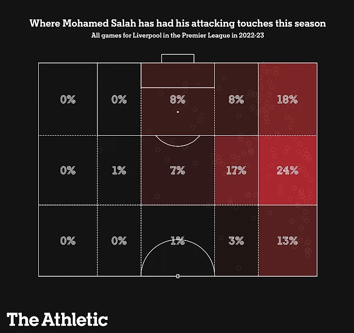 Если мы посмотрим на действия Салаха в этом сезоне и в прошлом сезоне, то они очень похожи. Одним из заметных факторов является то, что он начал сезон, имея больше мяча (18%) в этом правом углу по сравнению с 12%, которые он имел там за весь прошлый сезон.