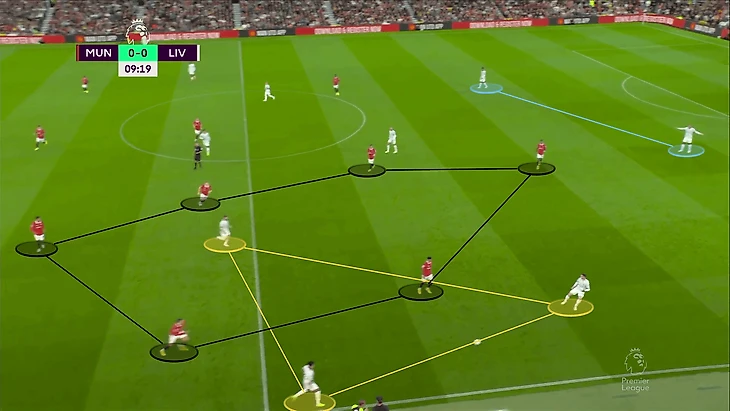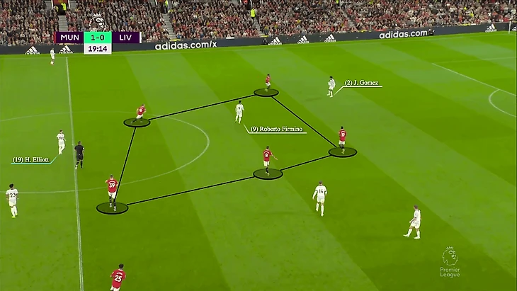 Приведенное ниже трио Луиса Диаса, Энди Робертсона и Джеймса Милнера должно использовать этот пасовый треугольник, чтобы избежать давления «Юнайтед» и продвинуться вверх по полю или переправить мяч на другую сторону.