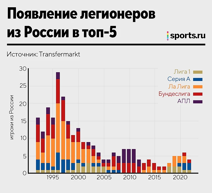 • Но рекордный показатель сезона-1996/97 вряд ли мы повторим скоро – тогда в сезонных заявках топ-лигах российские игроки встречались 29 раз. Правда, в АПЛ только два.