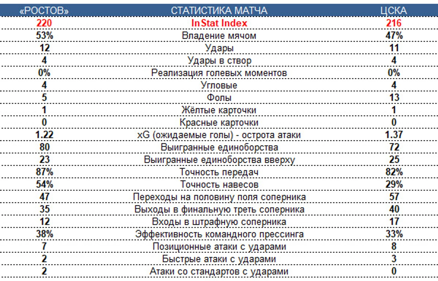 Счёт матча в соответствии с xG (ожидаемыми голами) – ничья 4:4. Лучший игрок матча по версии эксперта канала Матч-Премьер – Иван Игнатьев. Лучшие игроки матча по версии InStat Index – Антон Миранчук (249), Наир Тикнизян, Артём Карпускас (по 247).