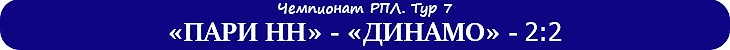 ⏱ «Пари НН» Нижний Новгород - «Динамо» Москва – 2:2 (0:2) 27.08.2022 (суббота). Начало – 15:00. Нижний Новгород. Стадион «Нижний Новгород». 6133 зрителя. Голы: 0:1 Фомин (17 с пенальти), 0:2 Тюкавин (30), 1:2 Калинский (61 с пенальти), Стоцкий (71). Удаление: Фернандес («Динамо», 66).