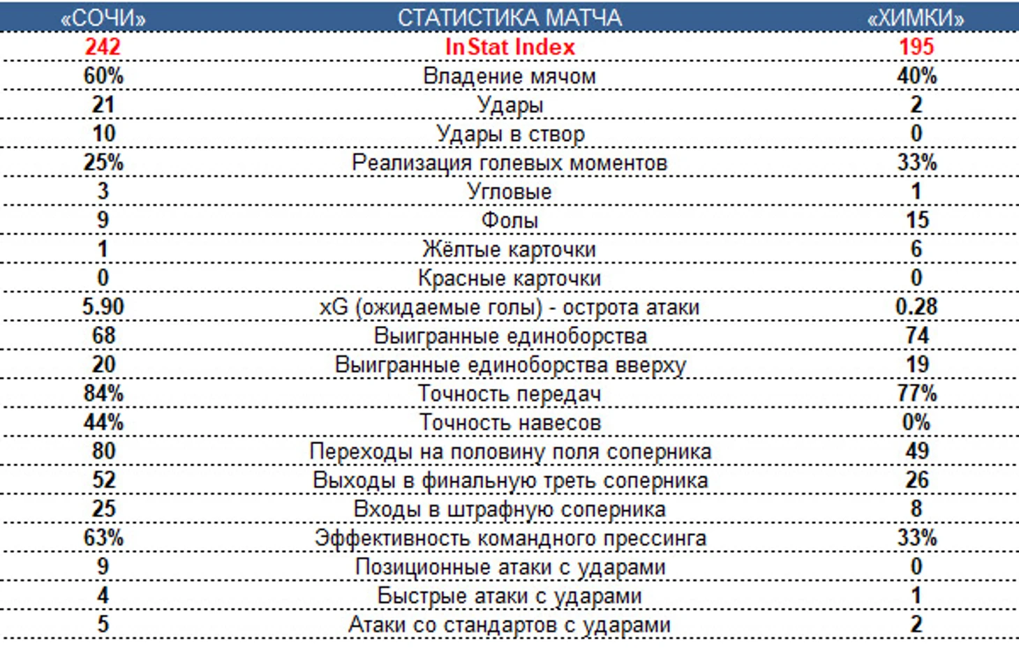 Счёт матча в соответствии с xG (ожидаемыми голами) – 7:0 в пользу «Сочи». Лучший игрок матча по версии эксперта канала Матч-Премьер – Тимофей Маргасов. Лучшие игроки матча по версии InStat Index – Артём Макарчук (276), Тимофей Маргасов (269), Никита Бурмирстров (268).