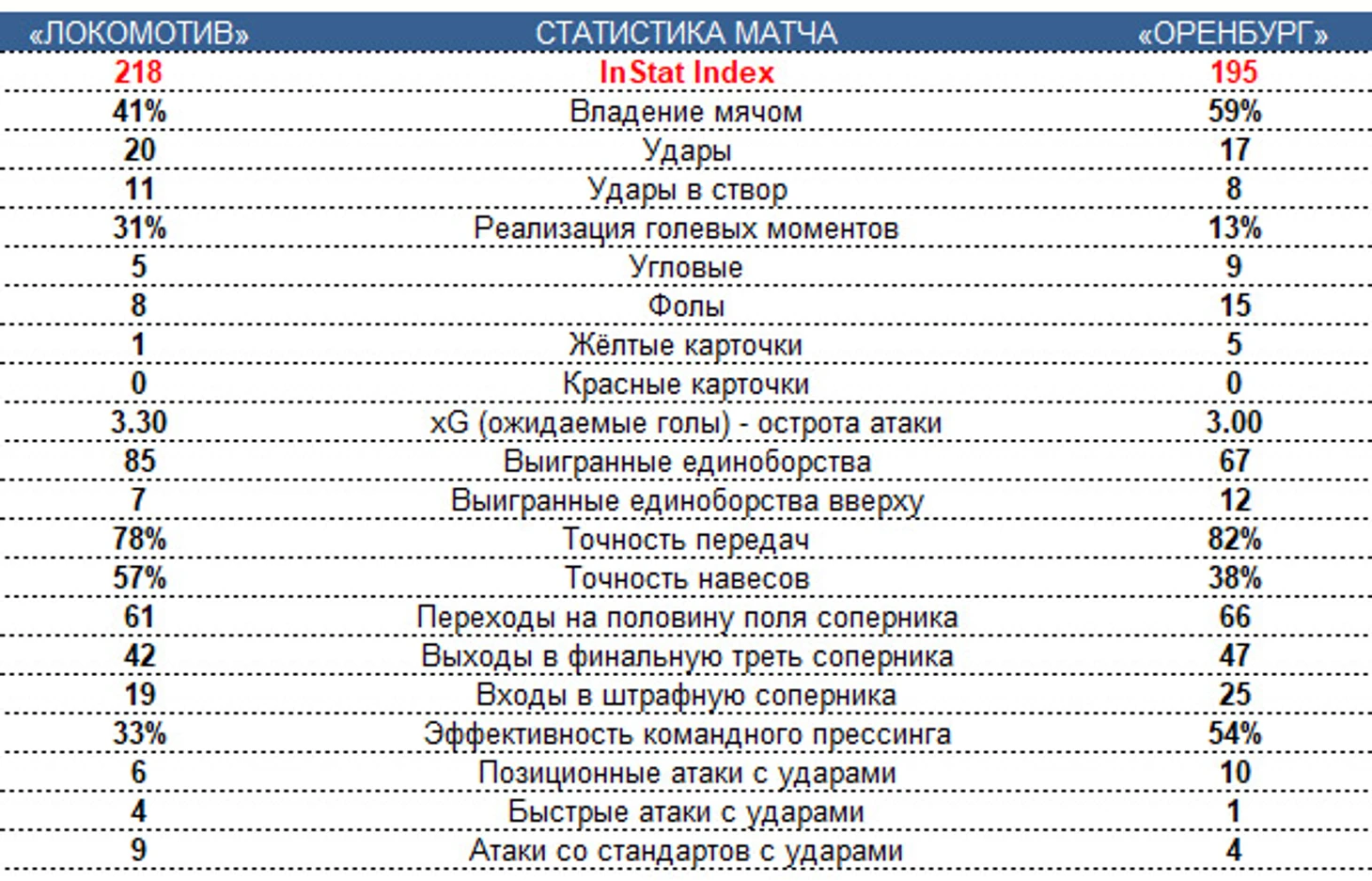 Марцел Личка, главный тренер «Оренбурга»: - Большая разница между нами и «Локомотивом» чувствовалась в защите. В первом тайме мы сделали подарки сопернику: отмечу фатальные ошибки во время второго и третьего голов. Можно сказать, что даже в молодёжных командах не допускают таких ошибок. Мы были приятным соперником для «Локомотива», потому что когда у нас были шансы бить по воротам, мы вместо этого старались сделать ещё одну передачу. Счёт по игре.