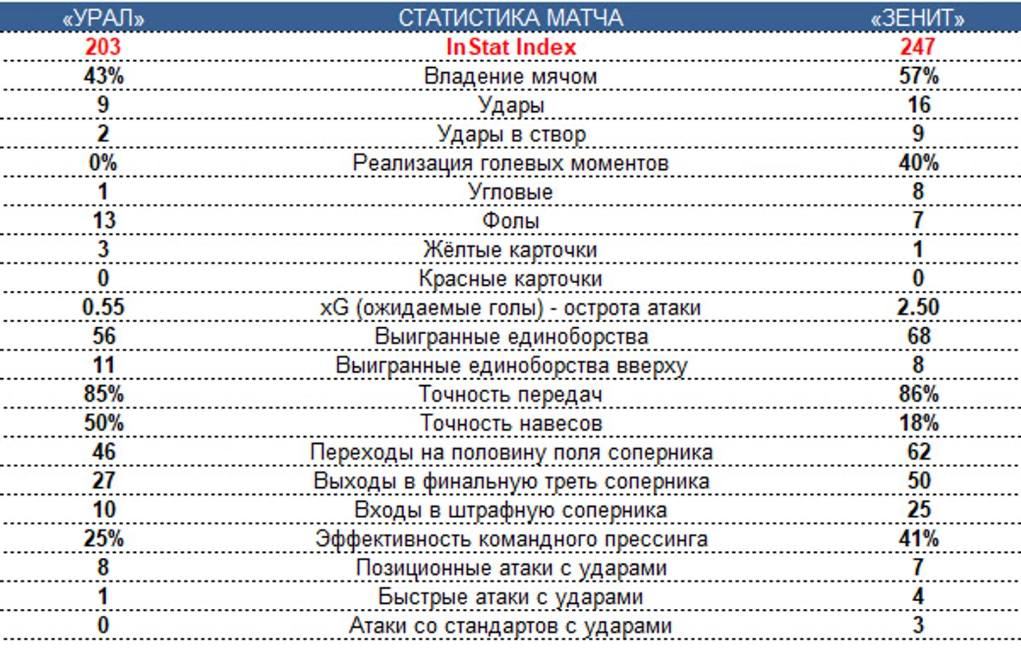 🕮 Факты: ◉ «Зенит» - единственная команда, которую «Урал» никогда не обыгрывал в Премьер-Лиге. Ни одной победы екатеринбуржцы не одержали и над «Пари НН», но с этим клубом они встречались всего два раза, а с «Зенитом» провели 23 поединка. ◉ «Зенит» 12 раз приезжал в Екатеринбург, чтобы провести здесь матч РПЛ, и только во время своего предыдущего визита не сумел поразить ворота хозяев поля, сыграв вничью 0:0. ◉ «Зенит», как и московское «Динамо», в первых таймах матчей нынешнего чемпионата России мячей в свои ворота пока ещё не пропускал. ◉ «Урал» не побеждает в РПЛ семь матчей. ◉ «Урал» на протяжении четырёх матчей не может забить мяч в чужие ворота. Это самая длинная текущая безголевая серия среди всех клубов РПЛ. ◉ Поражение 0:4 для главного тренера «Урала» Виктора Гончаренко стало повторением его самого крупного домашнего поражения в РПЛ. ◉ «Урал» набрал лишь одно очко после семи стартовых туров. Это повторение худшего старта екатеринбуржцев в чемпионате России: также одно очко после семи туров было у них в сезоне-2014/15. Тогда, к слову, екатеринбуржцы чудом остались в Премьер-Лиге. ◉ «Урал» обновил свой антирекорд результативности после стартовых семи туров сезона, забив всего-навсего один гол.