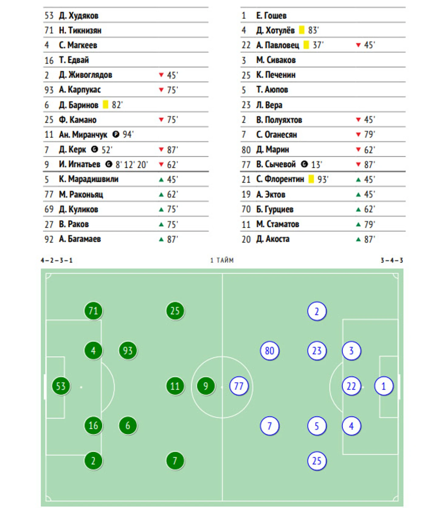 Сначала Миранчук покатил налево на Игнатьева, тот убежал от двоих соперников и «щекой» направил мяч в дальнюю «шестерку». Потом Миранчук отдал налево Тикнизяну, тот прострелил вдоль ворот на Игнатьева, и форварду оставалось только подставить ногу. И, наконец, вратарь «Локо» Худяков выбил мяч от своей штрафной к чужой, Игнатьев при попустительстве двух защитников принял эту сверхдальнюю передачу, убежал к воротам и пробил мимо голкипера Евгения Гошева.