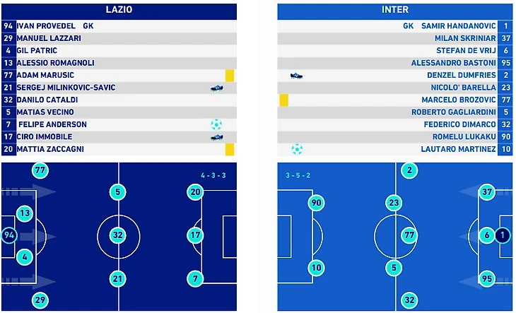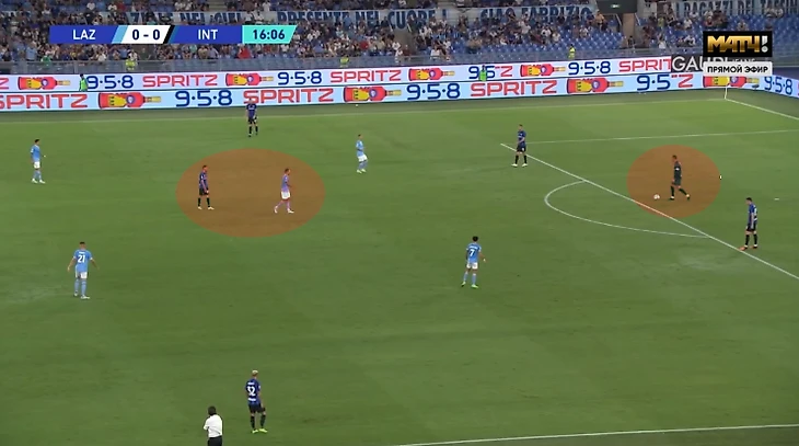 Иногда «Лацио» переходил на 4-5-1 при обороне, когда на острие оставался только Иммобиле. Вероятно, главной мотивацией такого построения было желание Сарри обезопасить команду от угроз, исходящих от фланговых игроков «Интера». При 4-4-2 «Лацио» получал преимущество на флангах, а быстроногим Думфрису и Димарко становилось сложнее находить свободное пространство.