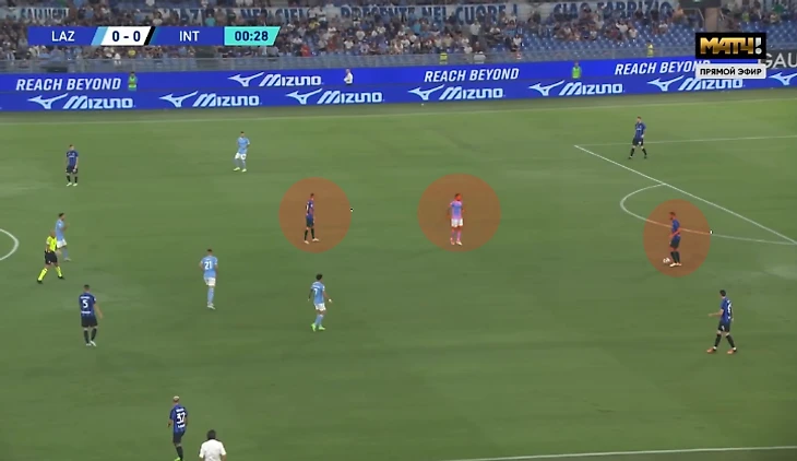 На этом отрезке при розыгрыше мяча у ворот «Интера» Чиро Иммобиле персонально контролирует Марцело Брозовича. Это выражается не только в персональной опеке: чаще всего нападающий «Лацио» располагался таким образом, чтобы отдать пас на игрока «Интера» было практически невозможно.