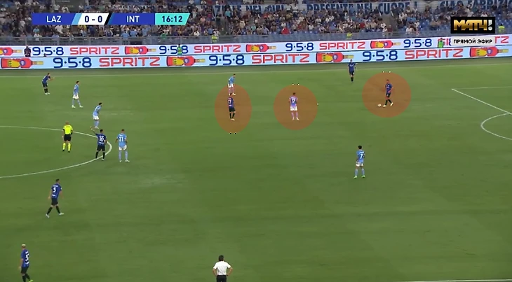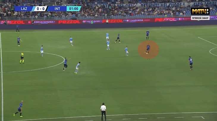На такую опеку Брозович отвечал отходом в линию к центральным защитникам, что является довольно обыденным решением. Например в этом моменте Иммобиле контролирует передвижение своего оппонента, однако позже Брозович оказывается практически на одной линии с де Вреем и Бастони.
