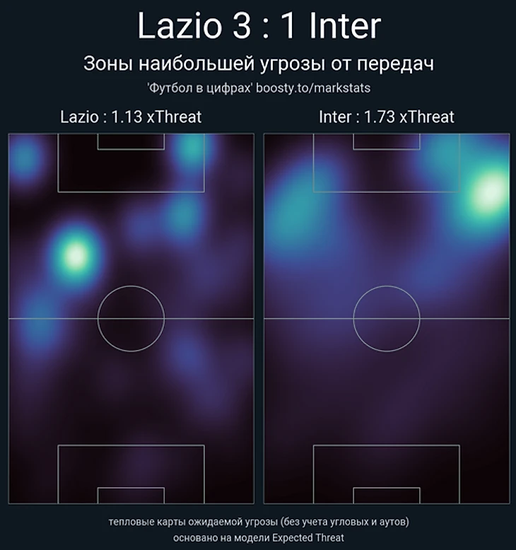 Замены Маурицио Сарри сыграли несравнимо лучше, чем изменения Симоне Индзаги. Тренер «Интера» решил снять с игры двух самых опасных, на мой взгляд, игроков своей команды: Думфриса и Димарко. По показателю xThreat они были одними из лидеров своей команды, а практически весь конструктив в атаке «Интера» приходил с флангов.