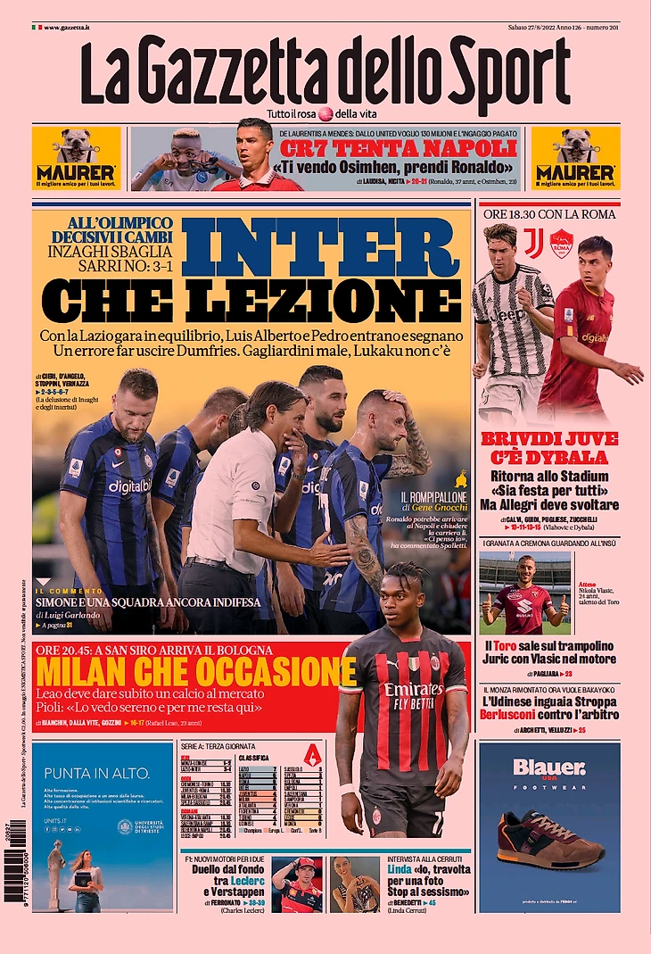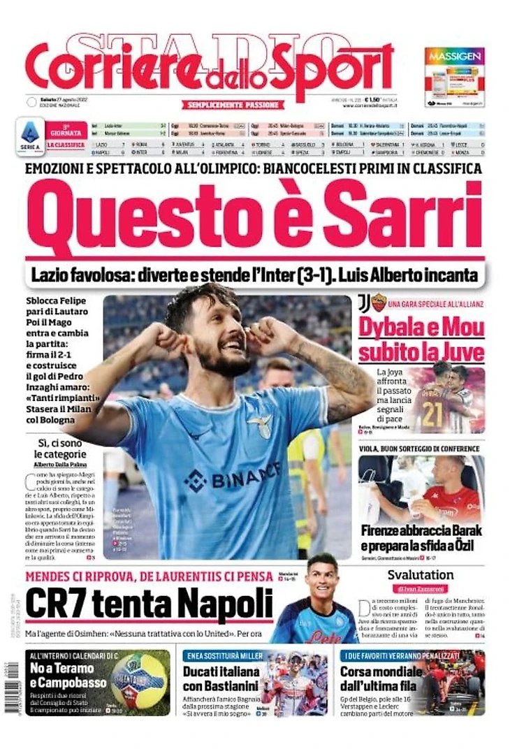 Это Сарри. Заголовки Gazzetta, TuttoSport и Corriere за 27 августа