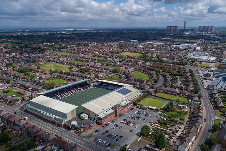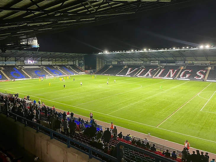 Обычная атмосфера пустующих трибун на матчах ФК «Уиднес». Обратите внимание на сочетание разметок футбольного и регбийного полей.